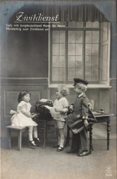 Illustrierte Postkarte; Fotografie, monochrom; Serie Ws+sB 731/6 Rückseite: drei Kinder (ein Junge in Uniform) in Büroszene mit Schreibmaschine; Text: Sind wir auch jung und klein noch blos, sind doch wir im Zivildienst groß! Vorderseite nicht beschrieben