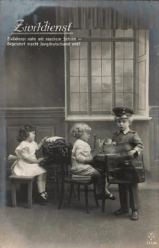 Illustrierte Postkarte; Fotografie, monochrom; Serie Ws+sB 731/1 Rückseite: drei Kinder (ein Junge in Uniform) in Büroszene mit Schreibmaschine; Text: Hurrah! Jungdeutschland zögert nicht, tut im Zivildienst seine Pflicht! Vorderseite nicht beschrieben