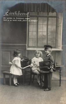 Illustrierte Postkarte; Fotografie, monochrom; Serie Ws+sB 731/5 Rückseite: drei Kinder (ein Junge in Uniform) in Büroszene mit Schreibmaschine; Text: Wir werden im Zivildienst siegen, sind ja so leicht nicht "klein" zu kriegen! Vorderseite nicht beschrieben