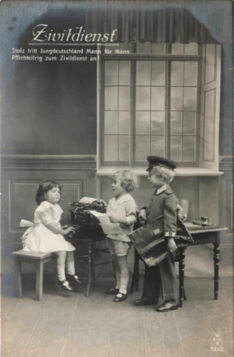 Illustrierte Postkarte; Fotografie, monochrom; Serie Ws+sB 731/2 Rückseite: drei Kinder (ein Junge in Uniform) in Büroszene mit Schreibmaschine; Text: Stolz tritt Jungdeutschland Mann für Mann pflichteifrig zum Zivildienst an! Vorderseite nicht beschrieben