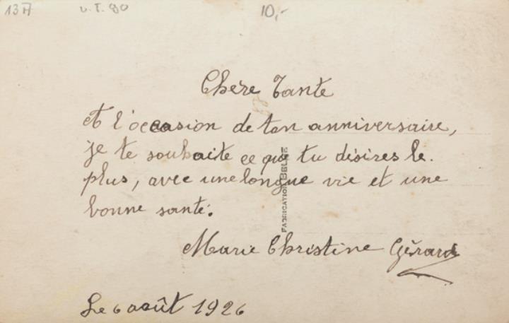 Illustrierte Postkarte; Fotografie, monochrom; Serie Lucia 1067 Rückseite: Mädchen mit Schreibmaschine, Blick zum Betrachter, Blumen als Dekoration Vorderseite: beschrieben, datiert 06.08.1926
