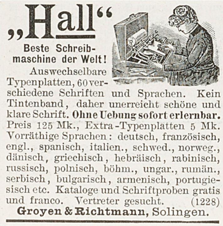 Werbeanzeige für Schreibmaschine Hall monochrom