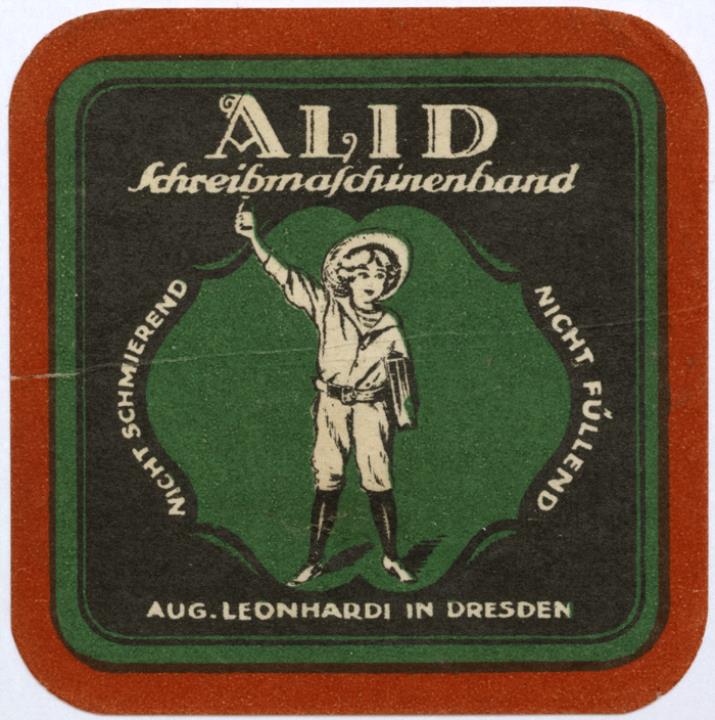 Siegelmarke für Schreibmaschinenband Alid des Schreibwarenherstellers Leonhardi; rechteckig, polychrom Text: nicht schmierend nicht füllend