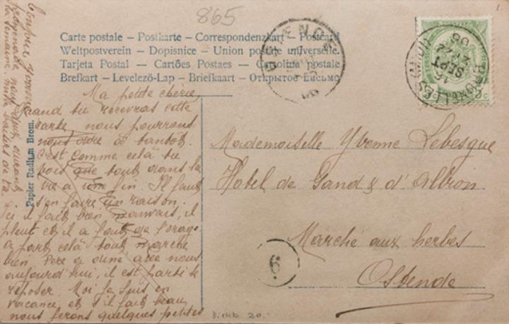 Illustrierte Postkarte; Fotografie, koloriert; Serie PH 865-3 Rückseite: Kind als Engel hinter Frau mit dekorierter Schreibmaschine, Briefblatt mit Aufschrift "Dienstag"; datiert Vorderseite: beschrieben; adressiert an Mademoiselle Lebesque, Ostende; Briefmarke Postes Belgique 5c; Poststempel Bruxelles/16 Sept 1906