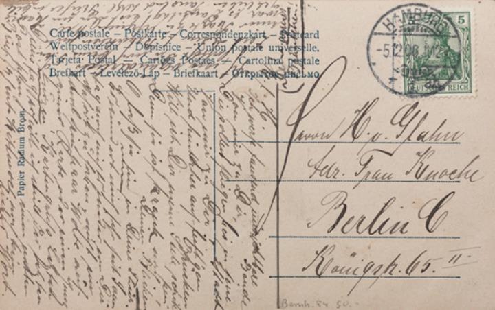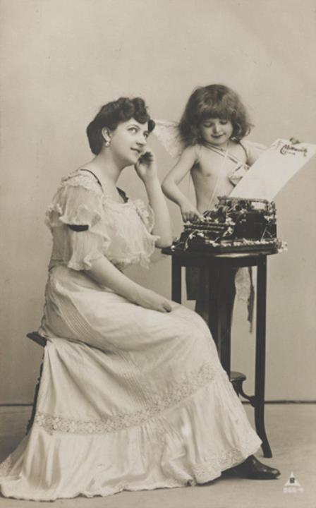 Illustrierte Postkarte; Fotografie, monochrom; Serie PH 865-4 Rückseite: Kind als Engel neben Frau mit dekorierter Schreibmaschine, Briefblatt mit Aufschrift "Mittwoch" Vorderseite: beschrieben und adressiert; Briefmarke Deutsches Reich 5 Pf., Poststempel Hamburg/5.12.1906