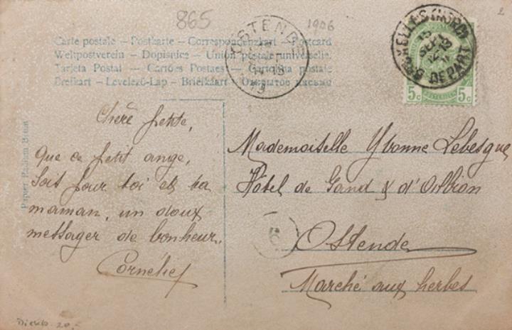 Illustrierte Postkarte; Fotografie, koloriert; Serie PH 865-5 Rückseite: Kind als Engel neben Frau mit dekorierter Schreibmaschine, Blick zum Betrachter, Briefblatt mit Aufschrift "Freitag"; datiert 14.9.06 Vorderseite: beschrieben; adressiert an Mademoiselle Lebesque, Ostende; Briefmarke Postes Belgique 5c; Poststempel Bruxelles/15 Sep xx