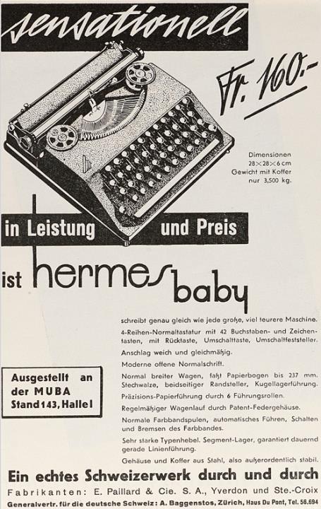 Werbeanzeige für Schreibmaschine Hermes Baby monochrom
