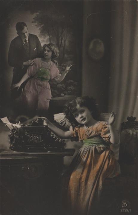 Illustrierte Postkarte; Fotografie, koloriert; Serie S 3339/1 Rückseite: Kind als Engel mit Schreibmaschine Ideal, im Hintergrund Mann und Frau als Paar Vorderseite beschrieben und adressiert