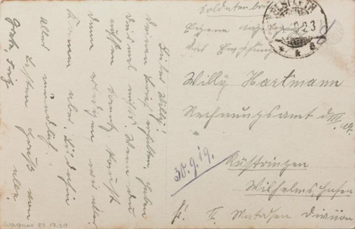 Illustrierte Postkarte; Fotografie, monochrom; Serie S 3339/6 Rückseite: Kind als Engel mit Schreibmaschine Ideal, im Hintergrund Mann und Frau als Paar; Text in Versform Vorderseite: beschrieben; adressiert an Willy Hartmann, Rüstringen; Poststempel Elsfleth