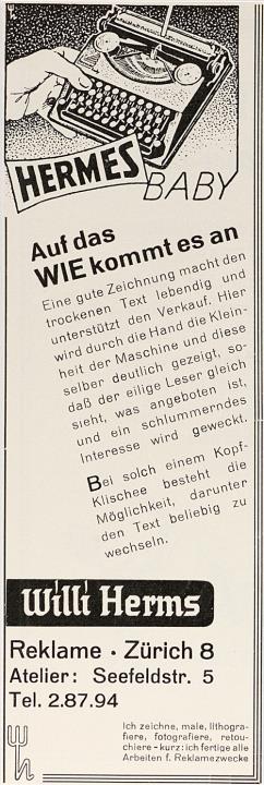 Werbeanzeige für Schreibmaschine Hermes Baby monochrom