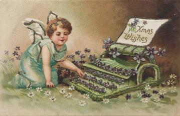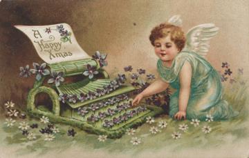 Illustrierte Postkarte (Weihnachten); Grafik, polychrom Rückseite: Engel mit Blumentasten-Schreibmaschine Vorderseite nicht beschrieben