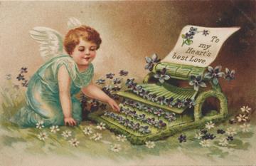 Illustrierte Postkarte; Grafik, polychrom Rückseite: Engel mit Blumentasten-Schreibmaschine Vorderseite: adressiert an Miss Hobart; datiert 14.02.1907