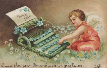 Illustrierte Postkarte; Grafik, polychrom Rückseite: Engel mit Blumentasten-Schreibmaschine; beschrieben Vorderseite: adressiert an Monsieur Linon, Ensival; Briefmarke Postes Belgique 5c; Poststempel Bruxelles/4 Mai 1905, Ensival/5 Mai 1905