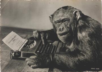 Illustrierte Postkarte; Fotografie, monochrom; Serie Zoo 228 Rückseite: Affe/Schimpanse mit Schreibmaschine Vorderseite mit Beschreibungtext: Zoologischer Garten Zürich, Schimpansin "Nanette"; nicht beschrieben