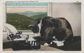 Illustrierte Postkarte; Grafik, polychrom; Nr. 507 Rückseite: Katze mit Schreibmaschine, Fensteraussicht auf Berglandschaft Vorderseite: beschrieben; adressiert an Mis. Kimball, Kearsarge; Briefmarke U.S. Postage 1 Cent; Briefmarke Hensonville/Jul 8 1931