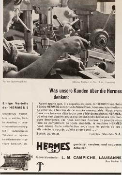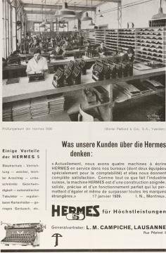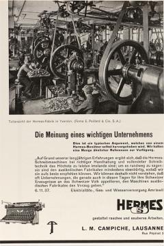 Werbeanzeige für Schreibmaschine Hermes 5 mit Innenansicht der Hermes-Fabrik in Yverdon monochrom