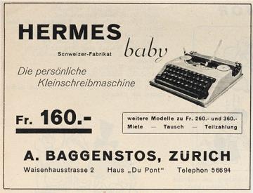 Werbeanzeige für Schreibmaschine Hermes Baby monochrom