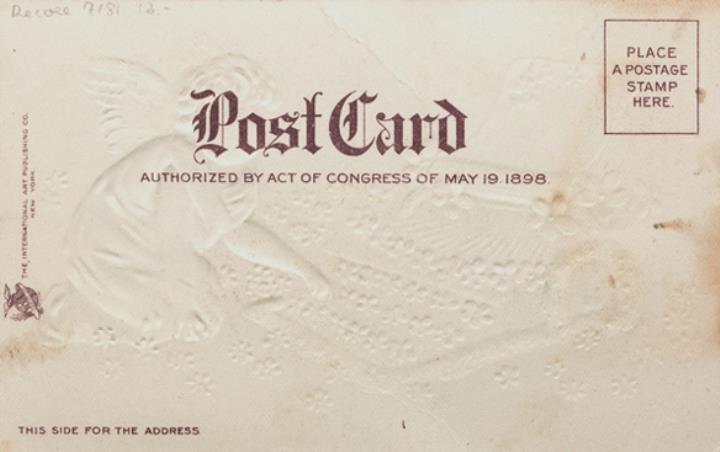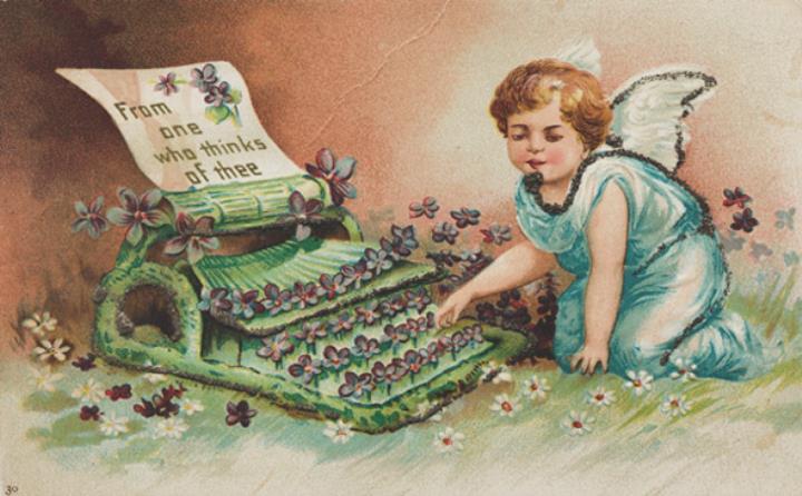 Illustrierte Postkarte; Grafik, polychrom Rückseite: Engel mit Blumentasten-Schreibmaschine Vorderseite nicht beschrieben