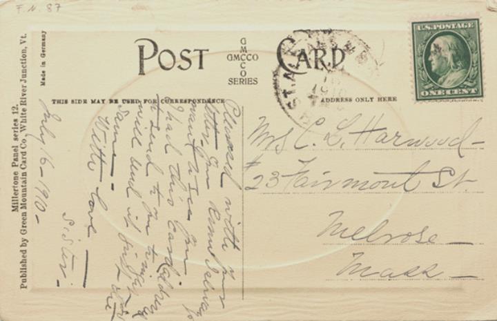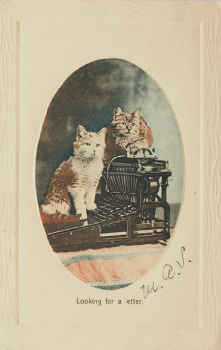 Illustrierte Postkarte; Fotografie, koloriert; Millertone Panel series 12 Rückseite: zwei Katzen mit Schreibmaschine als Ovalbild in Rechteckrahmen (Blindprägung); beschrieben Vorderseite: beschrieben; adressiert an Ms. Harwood, Melrose; Briefmarke U.S. Postage One Cent; Poststempel St. Albans/1910