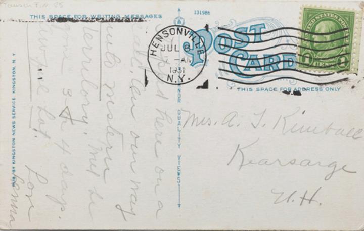 Illustrierte Postkarte; Grafik, polychrom; Nr. 507 Rückseite: Katze mit Schreibmaschine, Fensteraussicht auf Berglandschaft Vorderseite: beschrieben; adressiert an Mis. Kimball, Kearsarge; Briefmarke U.S. Postage 1 Cent; Briefmarke Hensonville/Jul 8 1931