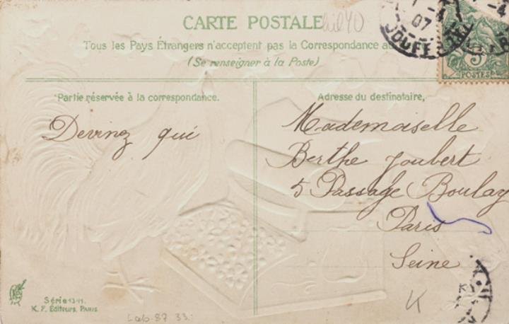 Illustrierte Postkarte (Ostern); Grafik, polychrom; Serie 1341 Rückseite: Küken und Hahn mit Blumentasten-Schreibmaschine Vorderseite: beschrieben; adressiert an Mademoiselle Joubert; Paris; Briefmarke Postes Francaises 5c (beschädigt); Poststempel 1 - 4 1907