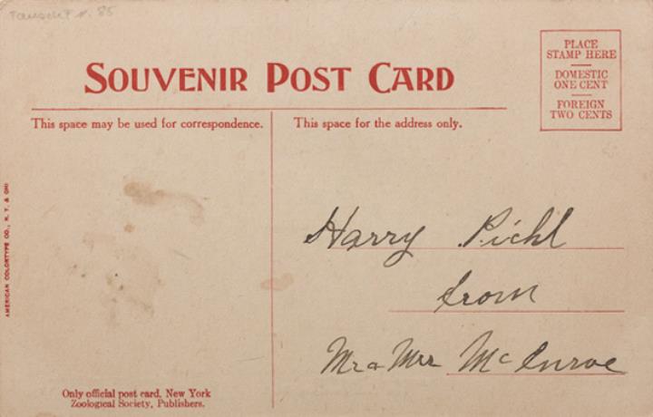 Illustrierte Postkarte; Fotografie, polychrom; Series B 3012 copyright 1907 New York Zoological Society Rückseite: Affe/Schimpanse mit Schreibmaschine Vorderseite beschrieben