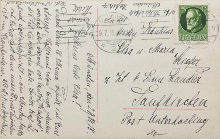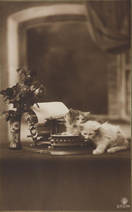 Illustrierte Postkarte; Fotografie, monochrom, mit Goldrand; Serie RPH 5713/14 Rückseite: zwei Katzen mit Schreibmaschine, Blumen als Dekoration Vorderseite: beschrieben; adressiert an Fräuleins Kiefer, Taufkirchen; Briefmarke Bayern 5 Pf.; Poststempel München/29.7.1915