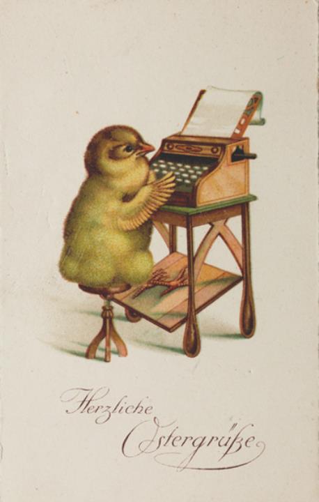 Illustrierte Postkarte; Grafik, polychrom; Nr. 8239-2 Rückseite: Küken mit Schreibmaschine Vorderseite beschrieben und adressiert