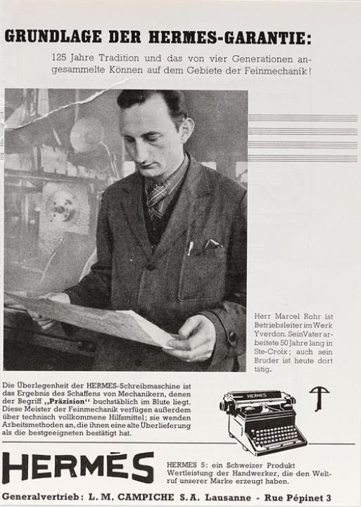 Werbeanzeige für Schreibmaschine Hermes monochrom
