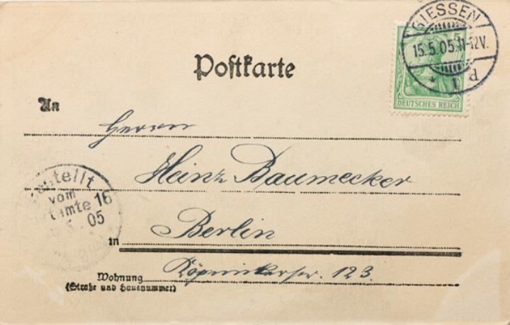 Illustrierte Postkarte; Grafik, monochrom Rückseite: Mädchen mit Hund und Schreibmaschine Lambert; Leerbereich beschrieben Vorderseite: adressiert an Herrn Baumecker, Berlin; Briefmarke Deutsches Reich 5 Pf., Poststempel Giessen/15.5.1905