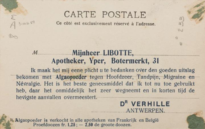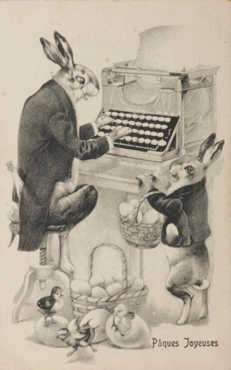 Illustrierte Postkarte (Ostern) mit Werbung; Grafik, monochrom Rückseite: Osterhasen mit Schreibmaschine Vorderseite: vorgedruckte Anschrift und Werbetext für Arznei