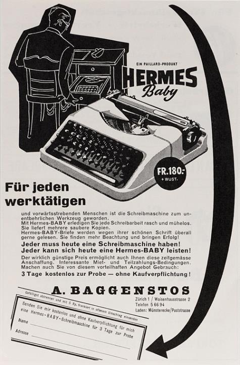 Werbeanzeige für Schreibmaschine Hermes Baby monochrom