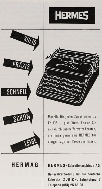 Werbeanzeige für Schreibmaschine Hermes monochrom