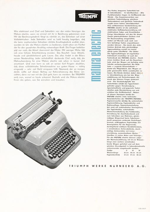 Prospekt für elektrische Schreibmaschine Triumph Matura Nr. 1285/458/9 Grafik: Brecht
