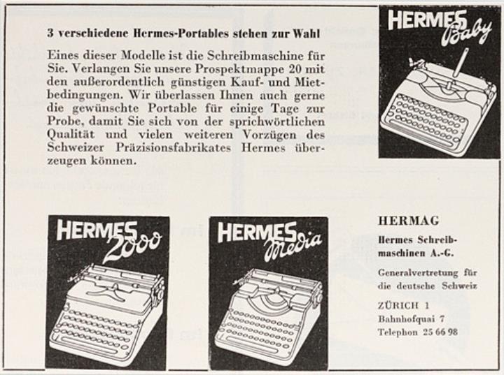 Werbeanzeige für Schreibmaschinen Hermes monochrom