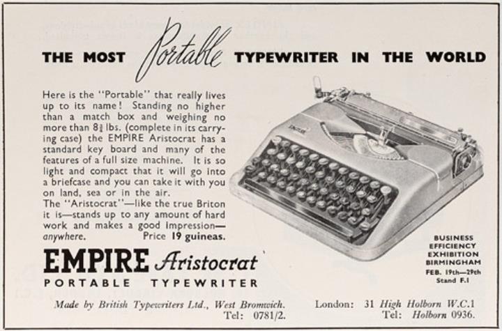 Werbeanzeige für Schreibmaschine Empire Aristocrat (Hermes) monochrom