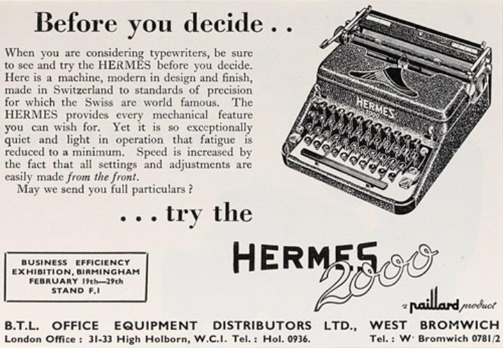 Werbeanzeige für Schreibmaschine Hermes 2000 monochrom