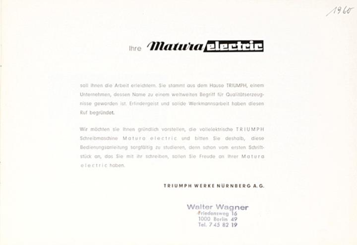Bedienungsanleitung für elektrische Schreibmaschine Triumph Matura Nr. 1472/560/6 Jahreszahl handschriftlich auf Anleitung vermerkt