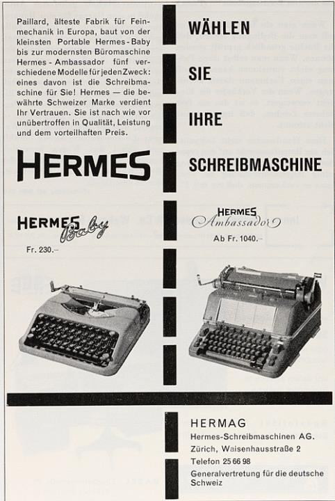 Werbeanzeige für Schreibmaschine Hermes monochrom