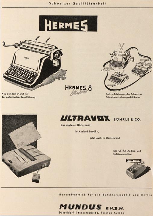 Werbeanzeige für Schreibmaschine Hermes und Diktiergerät Ultravox monochrom