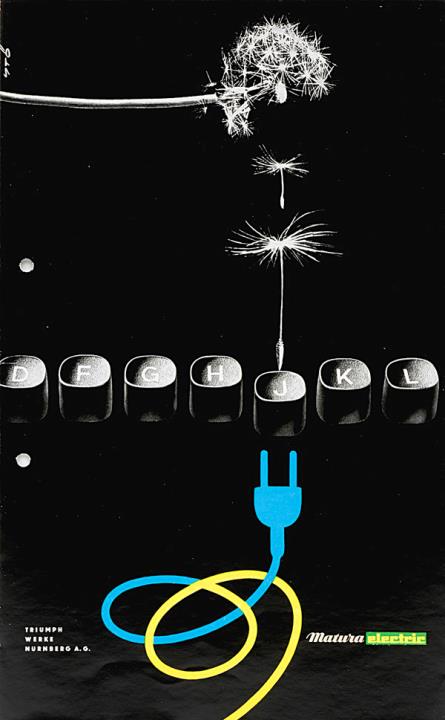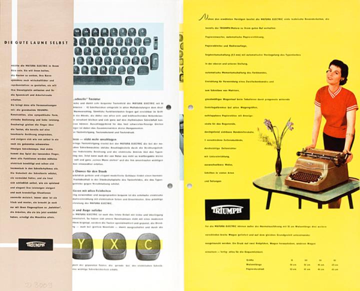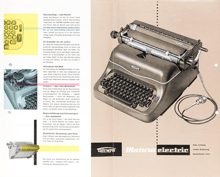 Faltprospekt für elektrische Schreibmaschine Triumph Matura Nr. 1208/257/pf. Grafik: Stöss