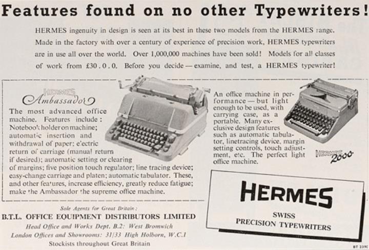 Werbeanzeige für Schreibmaschine Hermes monochrom