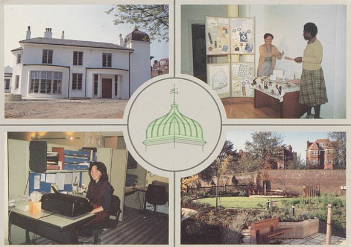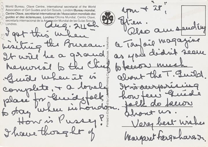 Illustrierte Postkarte; Fotocollage, polychrom Rückseite: vier Ansichten des Girl Guides and Scouts World Bureau, London Vorderseite beschrieben