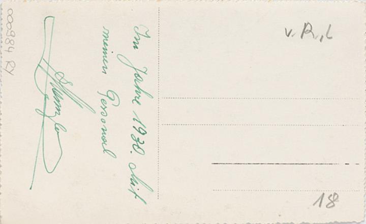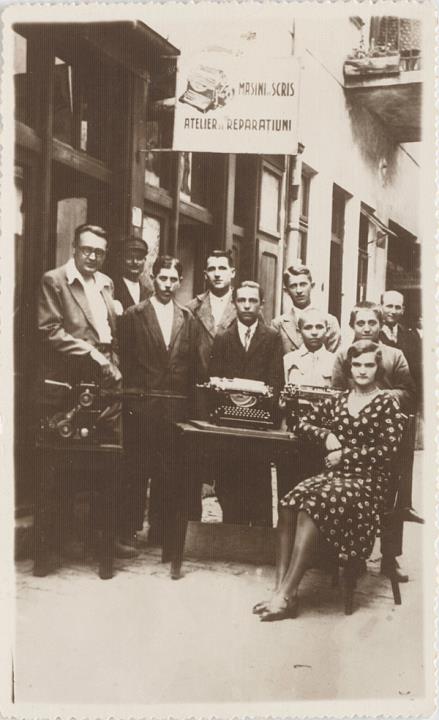 Illustrierte Postkarte; Fotografie, monochrom Rückseite: Chef und Belegschaft einer Schreibmaschinen-Reparaturwerkstätte posieren für ein Gruppenbild Vorderseite mit Vermerk: Im Jahre 1930. Mit meinen [sic] Personal; signiert