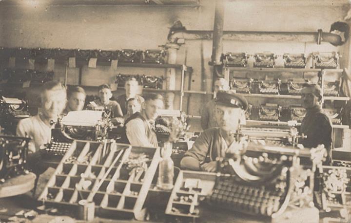 Illustrierte Postkarte; Fotografie, monochrom Rückseite: Mitarbeiter einer Schreibmaschinenfabrik posieren für eine Aufnahme, im Hintergrund Wandregale mit Schreibmaschinen Vorderseite nicht beschrieben