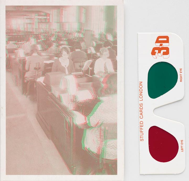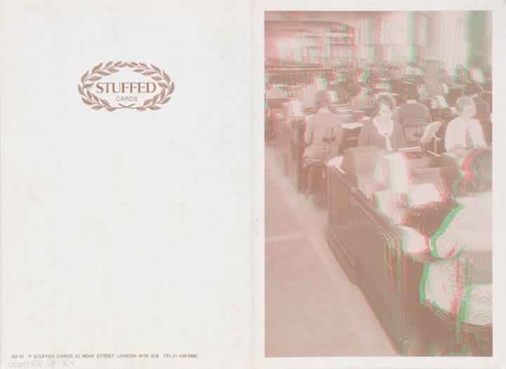 aufklappbare Grußkarte; 3-D Fotografie (anaglyph magenta/grün); Stuffed Cards London Nr. 3D10 Vorderseite: Ansicht eines Großraumbüros; Sekretärinnen mit Schreibmaschinen Innenteil nicht beschrieben Beilage: Rot-Grün-Anaglyphenbrille aus Karton