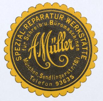 Siegelmarke für Schreibmaschinen-Reparaturwerkstatt A. Müller; rund, monochrom Text: München, Sendlingerstr. 16/1