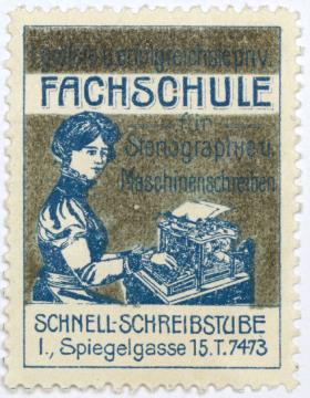 Reklamemarke/Werbemarke für Schreibschule Schnell-Schreibstube; rechteckig, polychrom Text: größte u. erfolgreichste priv. Fachschule für Stenographie u. Maschinenschreiben