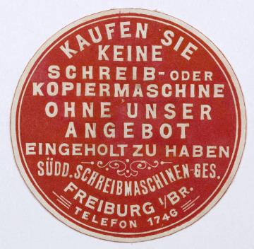 Siegelmarke für Süddeutsche Schreibmaschinengesellschaft Freiburg; rund, monochrom Text: [...] ohne unser Angebot eingeholt zu haben