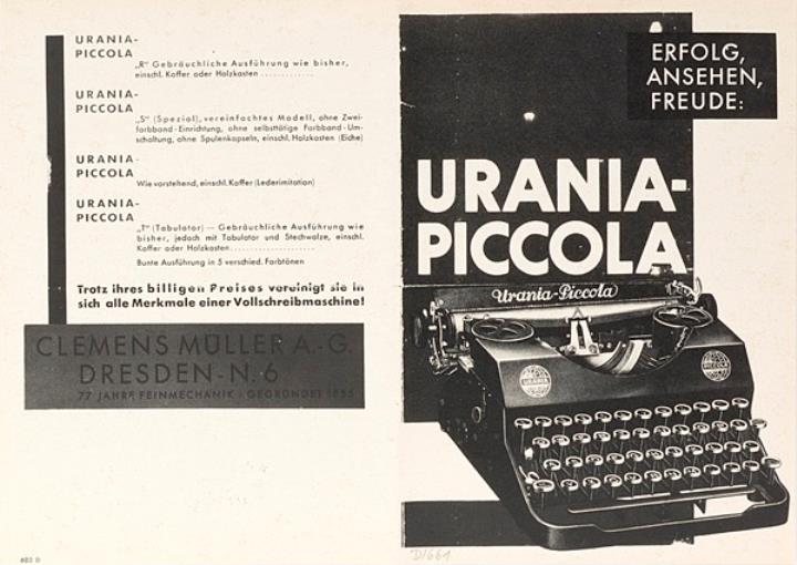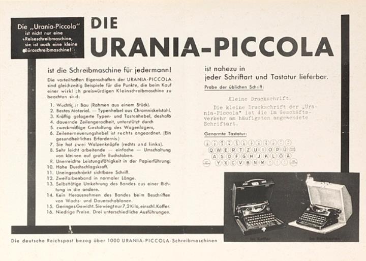 Prospekt für Schreibmaschine Urania Piccola Nr. 306 D Fotokopie